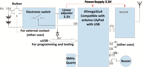 For the application described, apart from the circuit integration, the firmware uploaded to the ATmega32U4 of the transmitter is identical to the LoRa radio control’s original one, which means that, upon activation, it instantly activates the transistor that keeps the power-up, sends out the alarm message and deactivates the transistor by turning the board off; in fact, our additional hardware supports the TX’s native functioning.