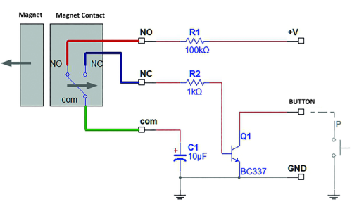 In order to apply this magnetic contact to the radio control board, we must keep in mind that it is impulsively activated by a key, while the magnetic contact is a persistent type of triggering. This is why we have to turn the magnetic contact activation into an impulse and we can do this by using a small adapter circuit as shown in Fig. 4. The alarm is triggered when the magnet, placed on the door, moves away from the magnetic contact, therefore, in normal position, the contact charges up a capacitor that is discharged on the base of a transistor when the door is opened, therefore the key is to short-circuit for some tens of milliseconds, enough time for the ATmega32U4 to intervene and pilot the transistor that keeps the power up.