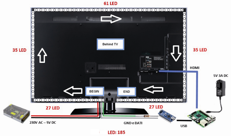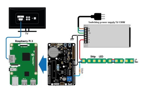 - LED strip power supply: 5V with proportionate current based on length of the LED strip’s Mike on this value must be calculated by adding up the length of four edges of the TV.