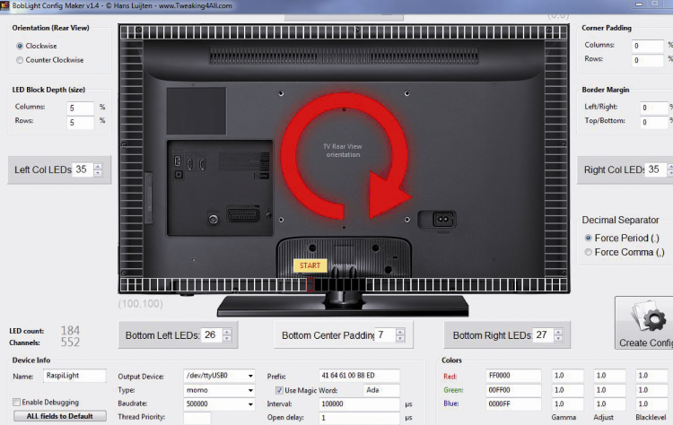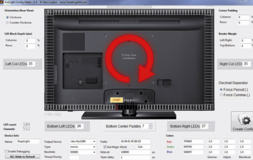 Let’s open the program and set all the values of the LEDs on the edges using the fields: Top Row LEDs, Right Col LEDs, Left Col LEDs, Bottom Left LEDs, Bottom Right LEDs and Bottom Center Padding; since we have mounted our strip clockwise, in the field Orientation (Rear View) are going to select “Clockwise”.