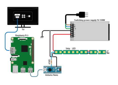 - Raspberry Pi 3: with Kodi installed it will become a media center, where a program will run in the background taking care of analyzing the edge of the video transmitted and send the information regarding LED colors to Arduino;