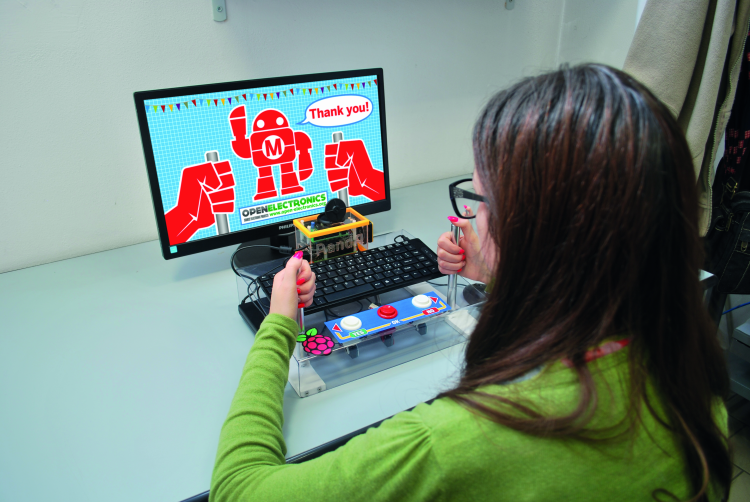 To interconnect Raspberry Pi to the three buttons through RandA, we made a simple shield that also interfaces the “Emotional sensors”. Referring to the specific circuit diagram, shown on these pages, we see that the three buttons are connected to IOD8, IOD9, IOD10 pins, connected respectively to D8, D9, D10 RandA lines. The two cylindrical electrodes that sense the “emotional level” are connected to SENS contacts, without a precise order: on the shield, one is connected to RandA 5V output while the other to a buffer made by the operational amplifier U1, the output of which terminates on RandA A0 line.