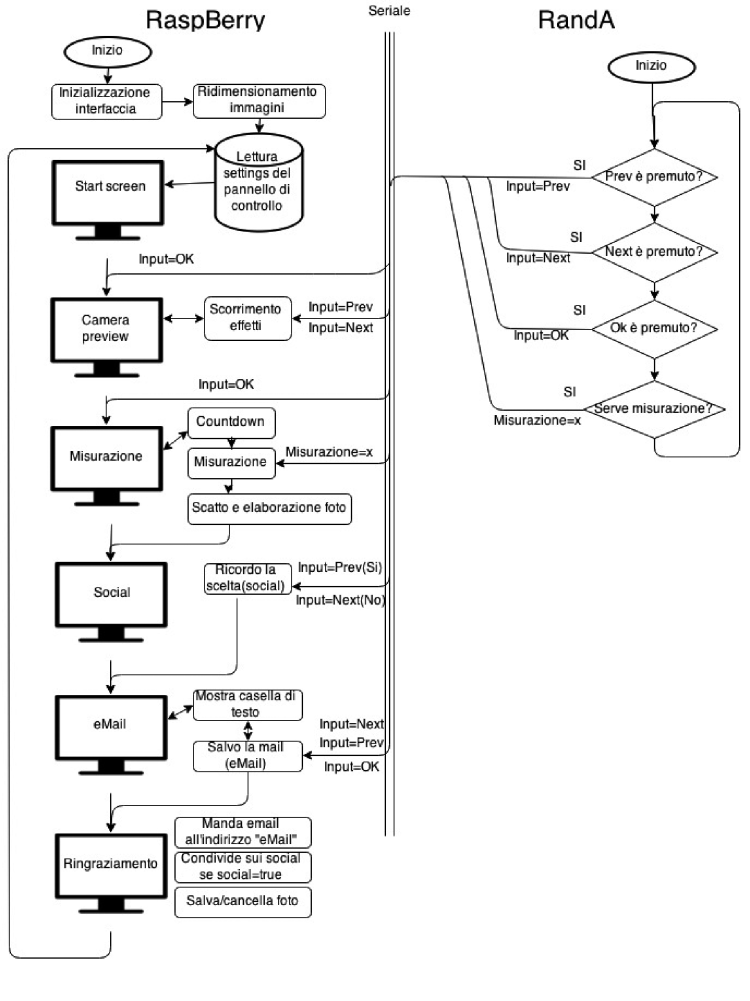 The user, through different software screens, can take a selfie (choosing a picture effect too) and measure his electrical conductivity (grabbing two conductors) which will be used to determine a score for the “feelings or theme” chosen. The result will be superimposed on the picture taken and then he can choose whether to share the photos on social networks, receive them via e-mail or simply watching them on the monitor.
