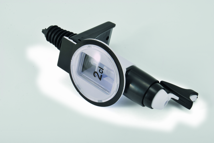 The tapster has an inlet with rubber seal multilabbro and a button by pressing which the nozzle dispenses the predetermined quantity.