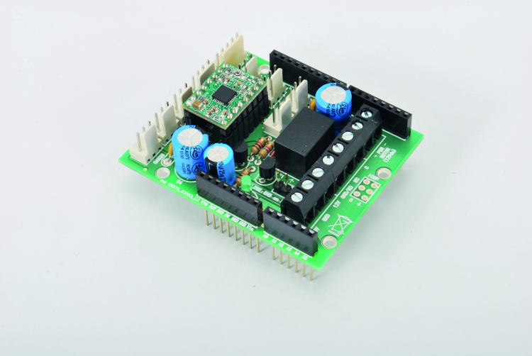 As regards the step by step motors driver, in the shield’s plan it is signed as U1; the module is essentially an A4988 integrated circuit from Allegro, and a very adaptable one since it can be set so to define both the rotation direction of the driving shaft, and the number of degrees that the motor’s rotor has to make when receiving each command. In other words, when we give a command impulse we may decide if the module has to rotate the drive shaft one step at the time, or by 1/2, 1/4, 1/8 or 1/16 of step, depending on the accuracy we want to achieve.