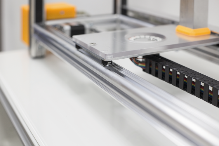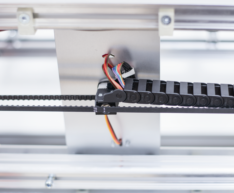 In the inferior part of the cart, on the short sides, two ball-casters with a 10 mm sphere are needed to make the cart slide along the cavities of the 1 meter long extrusions. The ball-casters have to be placed at a certain distance from the edges of the aluminium slab, so that they may slide within the cavities. The cart’s movement is achieved by fixing the belt around the pulley (on the right side) and to the stepper-motor. The same support, in addition to stopping the belt with a screw, is needed to move the lever of the limit switch. The position will be chosen, considering that the switch has to be pressed when the cart is fully placed at the beginning.