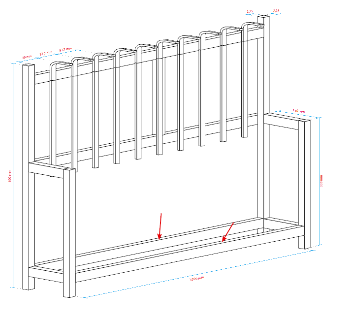 Machine frame: the 1-meter sections (arrows) must apply that limit the angular excursion of the carriage.