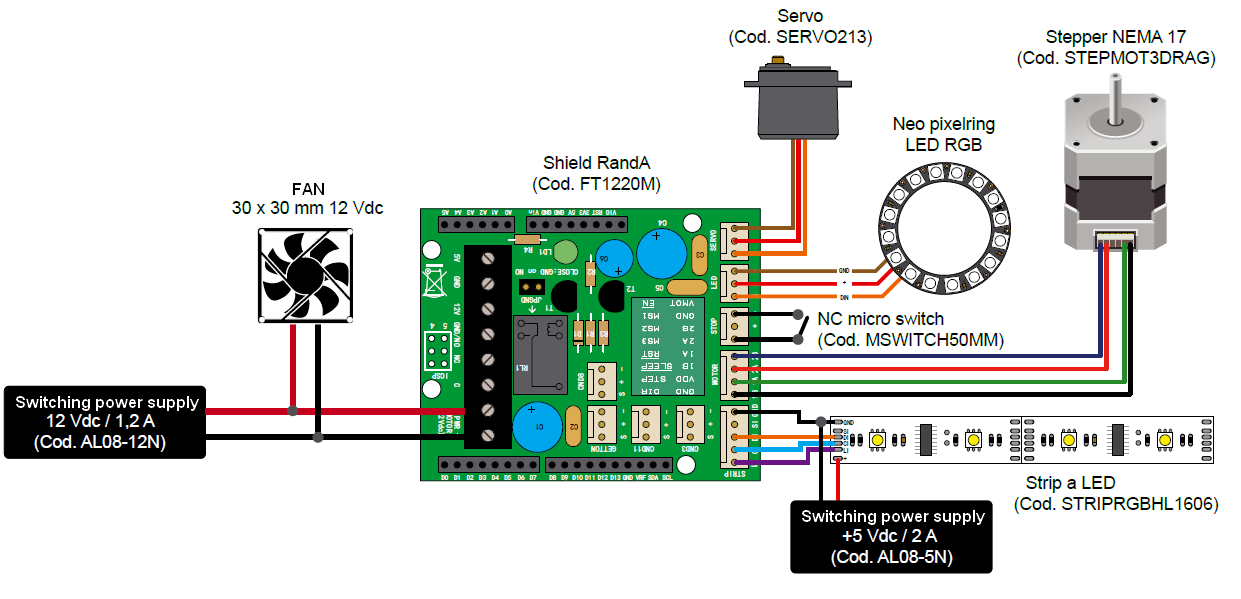 RandA’s sketch has been programmed by means of the modified IDE, that can be downloaded from our GitHub repository, and that enables loading via the network, by passing from Raspberry Pi. Thus you have to connect the latter to a PC in a network. Remember that if you want to use the LED strip as well, you will have to take into account a dedicated power supply for it, that is the one sold along with the said strip. On the other hand, a possible LED ring draws power from the shield’s 5 V line, in turn powered by RandA.