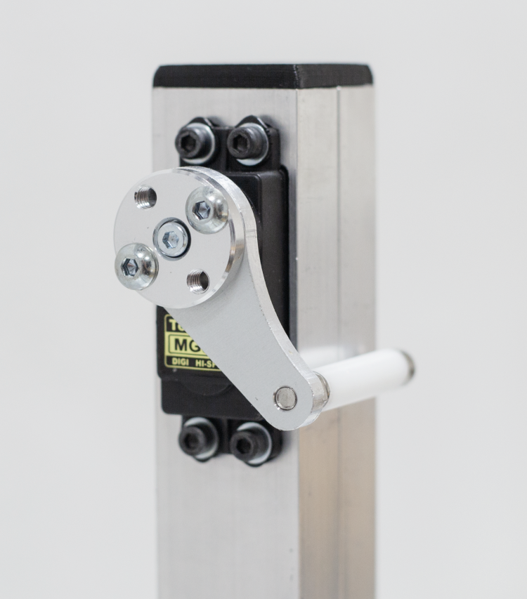 Our robotized drink-making machine is a chassis composed by aluminium extrusions, upon which dispensers are applied in a row: they are activated by a rear button, pressed by a lever commanded by a servomotor. Each time it is activated, each dispenser supplies a predetermined drink quantity, in our case corresponding to 2 cc (20 ml). Each dispenser is mounted upon a bottle carrier, that allows the insertion of the nozzle as gasket in the bottle neck, so to give stability to the whole.