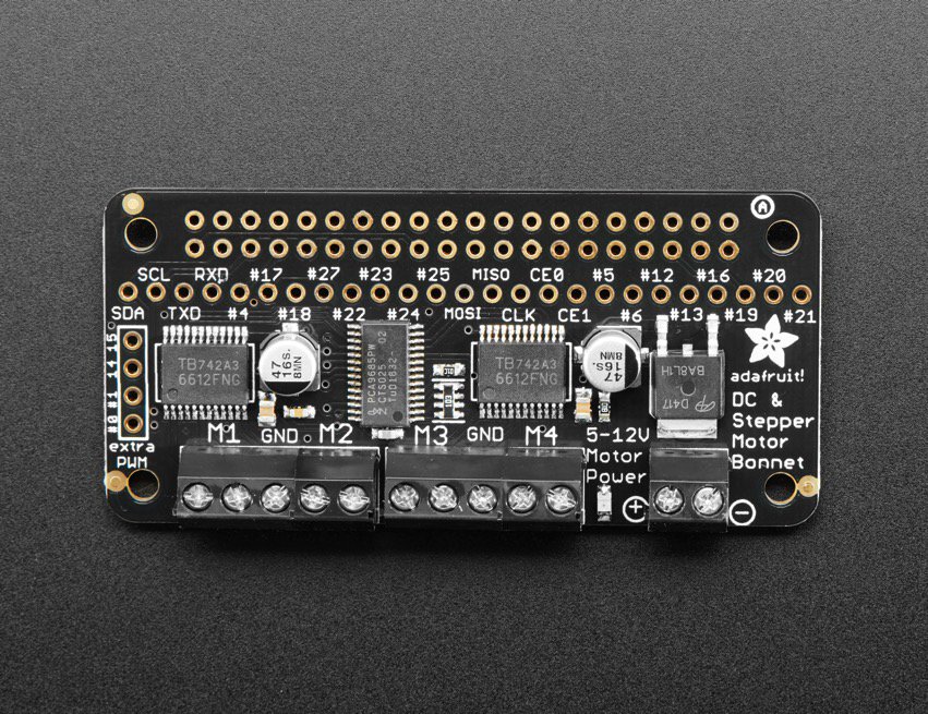 The Raspberry Pi bonnet can drive up to 4 DC or 2 stepper motors with full PWM speed control offering a great solution for robotics, DIY milling machines or 3D printers.