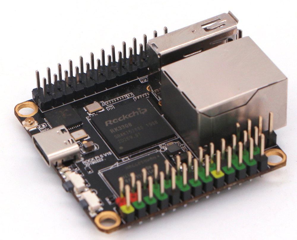 - Rock Pi S: presumably, this will be an open-spec community backed board like the Rock Pi 4. Aimed at IoT and audio applications, the headless SBC measures only 43 x 43mm. It is equipped with the new Rockchip RK3308 system-on-chip, featuring 4x low-power, 64-bit Cortex-A35 cores. The Rock Pi S offers a choice of 256MB or 512MB RAM plus a microSD slot and “1/2/4/8Gbit” of optional NAND flash.