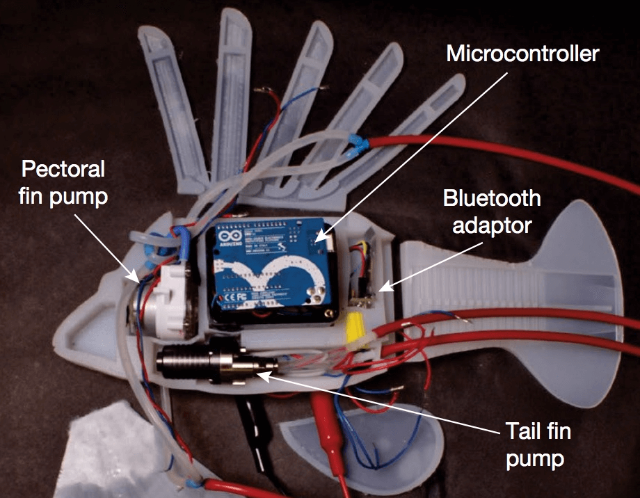 In total, the fish contains about 0.2 liter of blood, distributed throughout an artificial vascular system that was designed on a very basic level to resemble the structure of a real heart. The rest of the fish is made of structural elements that are somewhat like muscle and cartilage.