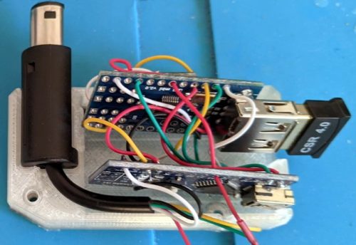 The adapter consists of an Arduino Nano and a MAX3421E module which interfaces to a common Bluetooth adapter.