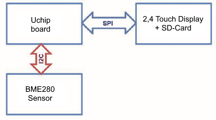 For our project, we use a hardware configuration described in the block diagram shown in Fig. 1. The core of the system is uChip, a module little larger than a 16-pin DIP IC, equipped with a 32-bit microcontroller. The TFT display, touch controller, and SD card are connected via SPI bus, while the sensor uses the I²C-Bus interface. A serial interface, two digital I/Os or three analogue inputs or one analogue output is also available for future applications. Thus, this system lends itself to developing numerous other applications.
