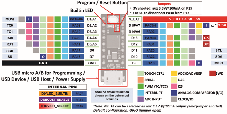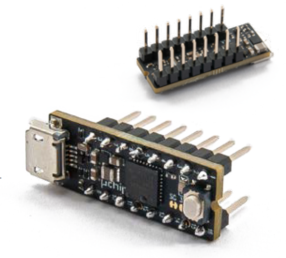 It is based on the Cortex M0 SAMD21-E18A MCU, 32 bit with 256 kB Flash memory (248 kB useful, the rest occupied by the integrated bootloader) and 32 kB static RAM and is compatible with Arduino Zero. It has two 8-pin strip connectors with an identical pitch to a DIL16 chip. Both sides of the board are visible in Fig. 2.