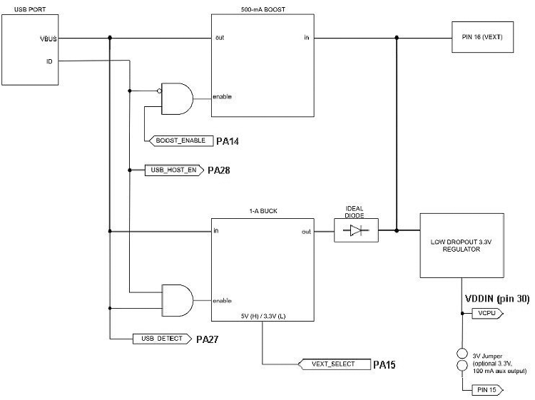 Uchip can be powered from 3.3V to 5V on pin 16 (VEXT) or 5V from the micro USB socket and has a very sophisticated power system, as seen in the functional diagram in Fig. 3.