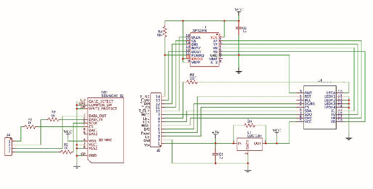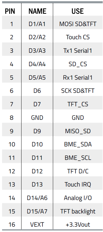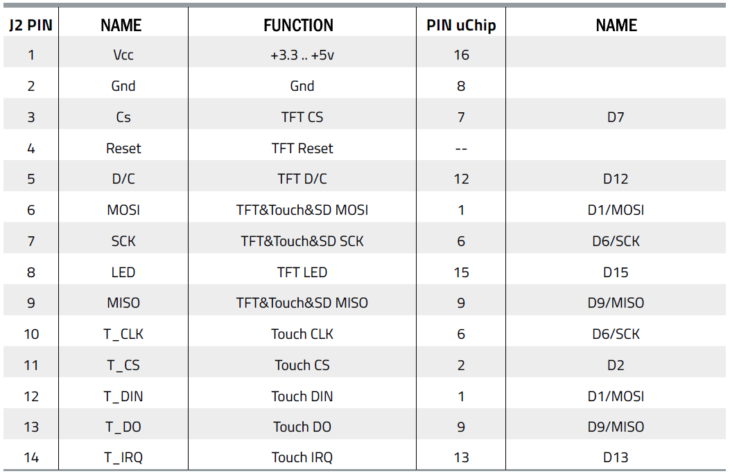 The display is a 2.4 inch 320×240 pixel TFT touch with 18-bit by 262k colours with 6-bit per colour encoding. The control chip used for this display is an ILI9341 while the Touch Screen Controller is an XPT2046. The pictures in Fig. 5 show the display board used; as you can see, on one side it has a 14 pin connector for the display and the touch controller, on the opposite side a 4 pin one for the SD-Card. Fig. 6 shows the schematic of this board, while Table 2 shows the connections with uChip made in this project. The signals on the board are TTL at 3.3V and this is not a problem for uChip working at this voltage. The display can still be powered at 5V thanks to an LDO regulator that provides the exact voltage to power the TFT and SD. To reduce the I/O pins and to optimize the interface, the display graphics controller, the SD, and the touch controller were merged into a single SPI bus. To save pins, the MCU-driven reset was also dispensed with by connecting it to an RC (47kΩ and 100nF) on pin 4 of the TFT.