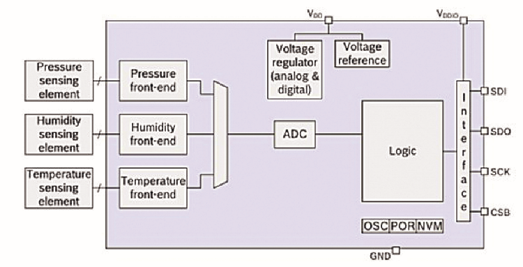 It can be powered with a DC voltage between 1.7 and 3.6V; in our case, it is powered at 3.3V by the LDO (low drop-out) regulator inside the module (to the breakout board on which the sensor is commercially available). Fig. 7 shows the functional diagram of the sensor. All details on the Bosch sensor can be found in the technical document BME280 “Combined humidity and pressure sensor” available on the Web.