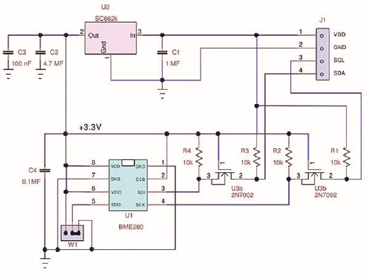 A schematic of this board has been derived in Fig. 9. It incorporates a 3.3V LDO regulator and a level adapter, necessary to connect it to an Arduino Uno or other microcontrollers powered at 5V, in the case of uChip the signals must be at 3.3V and these components are completely unnecessary. This board, having only 4 pins, provides only the I²C interface (CSB=1).