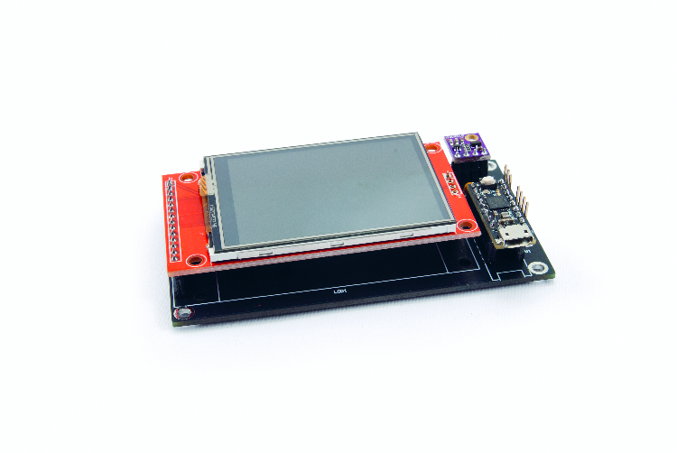 Equipped with an SD card and RTC, it detects and stores temperature, humidity and barometric pressure using a combined sensor, showing the data graphically on a touch display.