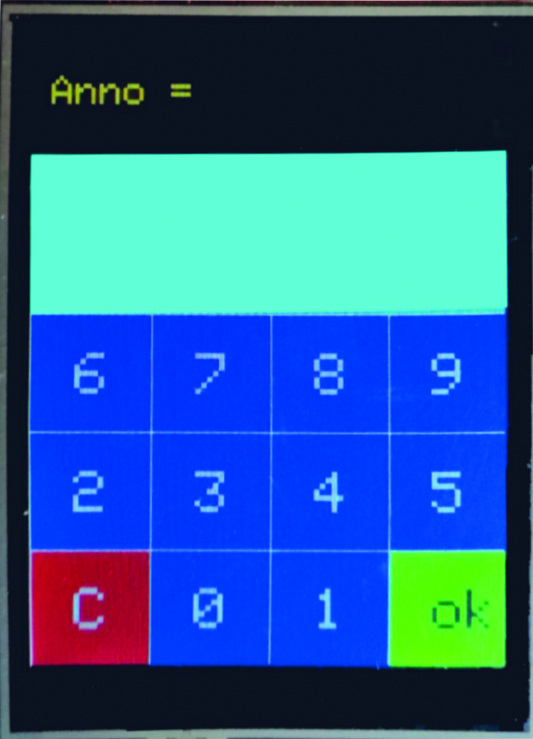 The first time it is necessary to press the last button, “SETTINGS” in blue colour, to set the sampling period in seconds, then a year (the last two digits), month, day, hour, minutes and seconds. To set these seven numeric parameters you use the GetNum(String prompt) function that activates the virtual numeric keyboard, as seen in Fig. 12.