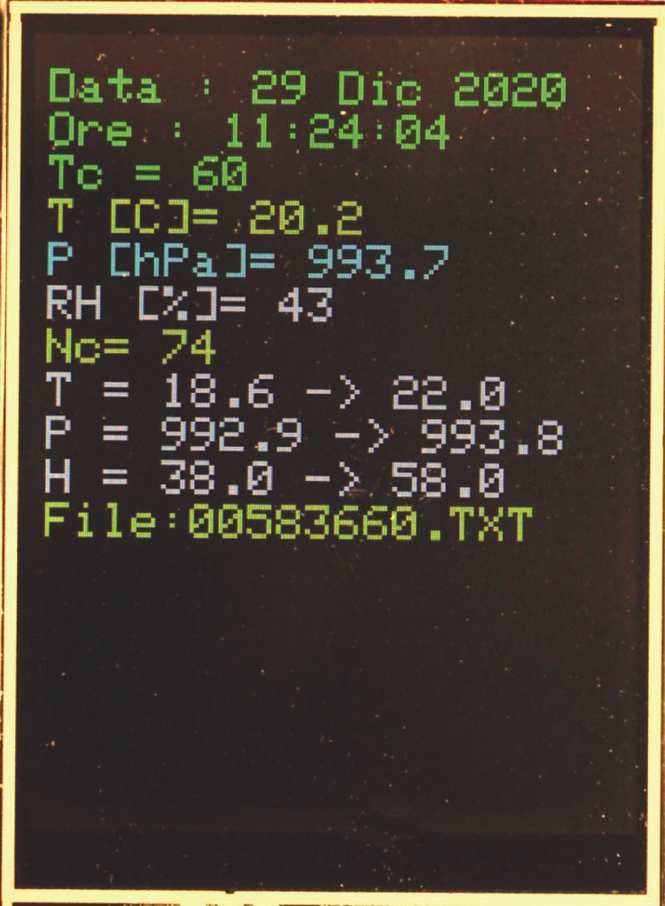 The second key, “MEASUREMENTS”, shows the date and time of the last sampling, the values of the measurements, the number of samples saved on SD, the minimum and maximum values of the measurements and the name of the file, as shown in Fig. 13.