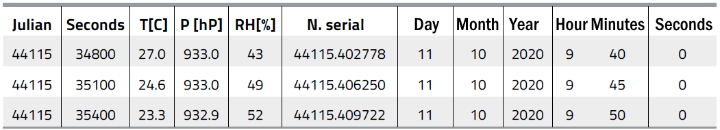 The data was processed in Matlab, but it can also be processed with a spreadsheet. In Excel the function DATA.VALUE(“11/09/2020”) returns the serial number 44085, the date is passed as a string. Given the serial number, the inverse function DAY(44085) returns the number 11, MONTH(44085) the number 9 and YEAR(44085) the number 2020. If you also enter the fraction of a day, you can also get the hour, minutes, and seconds. Table 3 is an example of this: