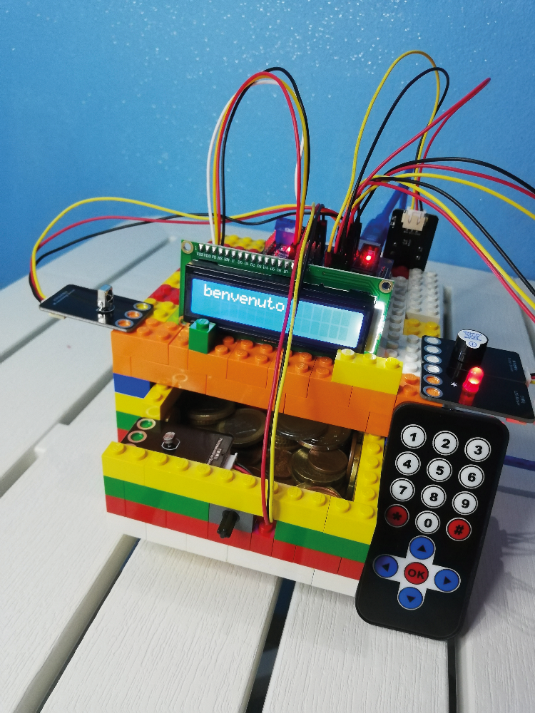 The remote control uses infrared technology to communicate with the IR receiver module. The receiver has 3 pins: GND, VCC (5V) and Signal (digital pin D11), while the remote control has 10 numeric keys, 4 arrows, hash mark, asterisk and ok. Infrared transmission is at a high frequency (approximately 38 kHz) from the remote control, which emits a sequence of bits (0 and 1) representing the various buttons; this sequence is intercepted by the receiver which, via the program, knows which button it corresponds to.