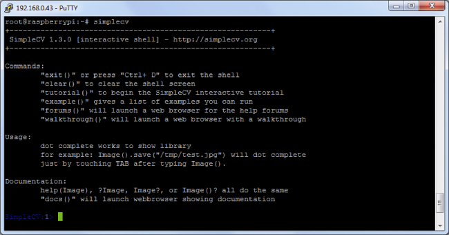 Once done with installations, we can carry out the first verifications by making use of the interactive shell supplied with SimpleCV (an equivalent function to the one available in the Python language). Let’s use the shell to verify the proper running of the OpenCV library, by typing in the command: