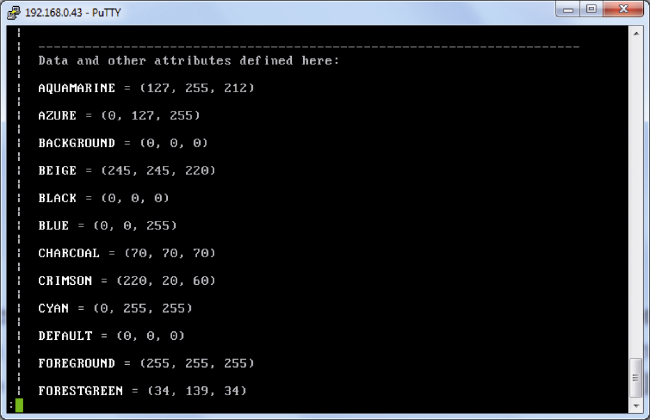 In this representation, triplets with identical values all represent shades of grey. Luckily, by using SimpleCV it is not needed to know all the numerical representations of the colors, since the major ones can be recalled by name, as GREEN, RED, YELLOW, and so on, by typing in: