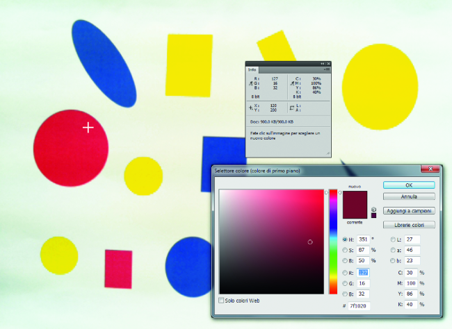 In this, and for each one of the listings that follow, we have pointed out saving of the intermediate images that are obtained during the process, so to analyze them subsequently. The pictures are then saved in the /home folder, from which they can be taken (e.g.: by using WINScp), so to open them with a visualization and/or graphic editing software. We will obtain the result that can be seen in figure, that shows the pixel value as (127, 16, 32). We can verify the correctness of the result by opening the picture with Photoshop and by visualizing the pixel value. They correspond perfectly.