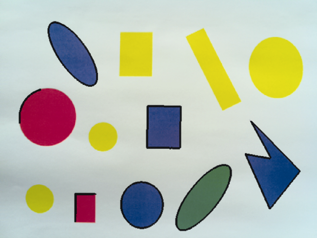 By the way, the command help(something) is the one to obtain help from SimpleCV; the help menu can be recalled with help(). Once the picture representation mode has been understood, it becomes easier to understand its processing modes. Let’s see now some easy examples, so that you can see with your own eyes, even if very briefly, the problems connected to image processing. As a reference base, we shall use a sheet upon which we have printed all the geometric format shapes, sizes and different colors.