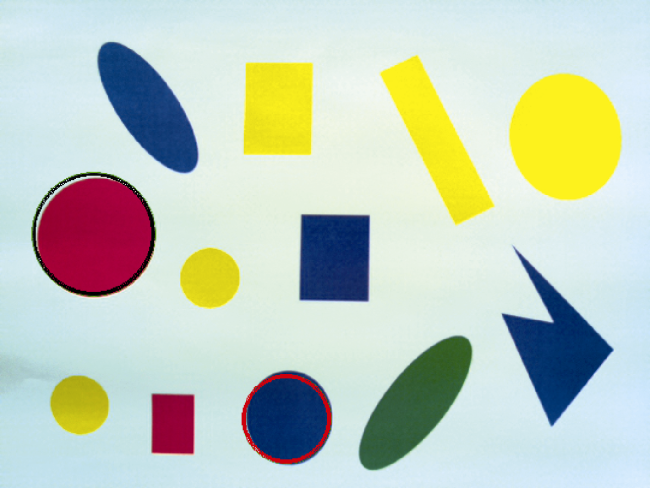 After having launched the program, you will probably find out that the dark green ellipse is recognized as well: the color is “quite” similar to the blue, in fact. The lighting conditions may influence very much the recognition results. Once again… do experiment.
