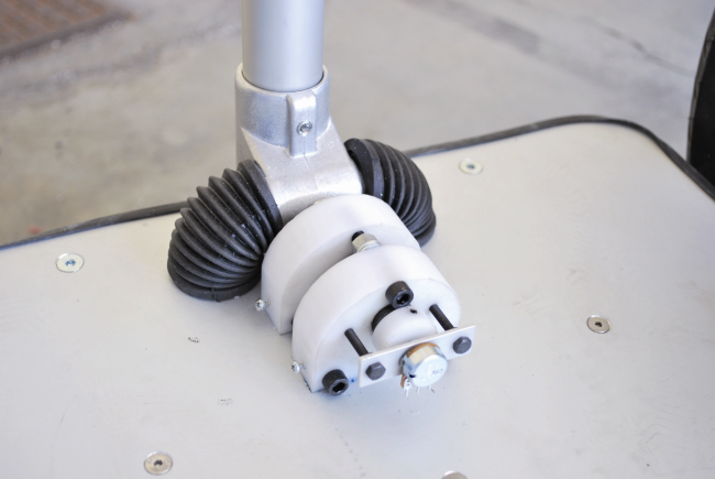 A significant part of the mechanical work needed is due to the realization of the handlebar, which is not rigidly attached to the platform, but allows a transverse rotation movement to approximately ± 30 °. The shaft of a potentiometer is splined on the pivot pin placed near the footboard and measures the inclination of the handlebar. It will be, in fact, the amplitude of the inclination of the handlebar to impart the steering command to the vehicle by varying the rotation speed of the two wheels (as in tanks..woo!): the speed of the inner wheel will be reduced while the rotation speed of the outer wheel will increase.