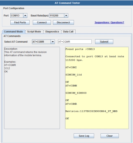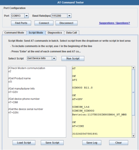 Users can send batch of AT commands under the ‘Script Mode’ tab. They can also save and load the script from the local machine. Users can develop their own scripts for specific set of tasks such as call setup , send SMS, HTTP access etc. Users can also include descriptive comments in their script.