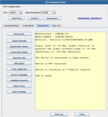 Users can perform basic troubleshooting of the modem under the ‘Diagnostics’ tab. Here the AT Command Tester tool sends the required AT commands and provides descriptive output about the state of the modem.