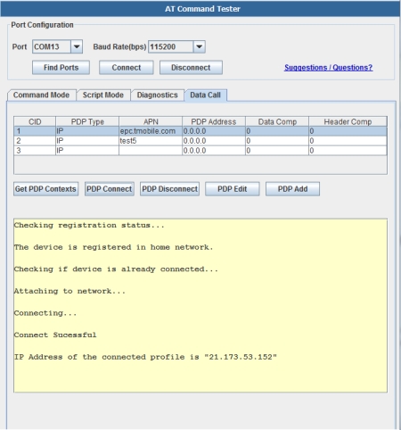 The ‘Data Call’ tab provides the interfaces to setup data call with the GSM network. ‘Get PDP Contexts’ button will list all the PDP context profiles stored on the SIM. Users can also add or update new PDP context profile. Users can then connect to the selected profile. AT Command Tester will first check whether the device is registered on the network. If so, it will attach and connect to the network with the selected PDP context credentials.