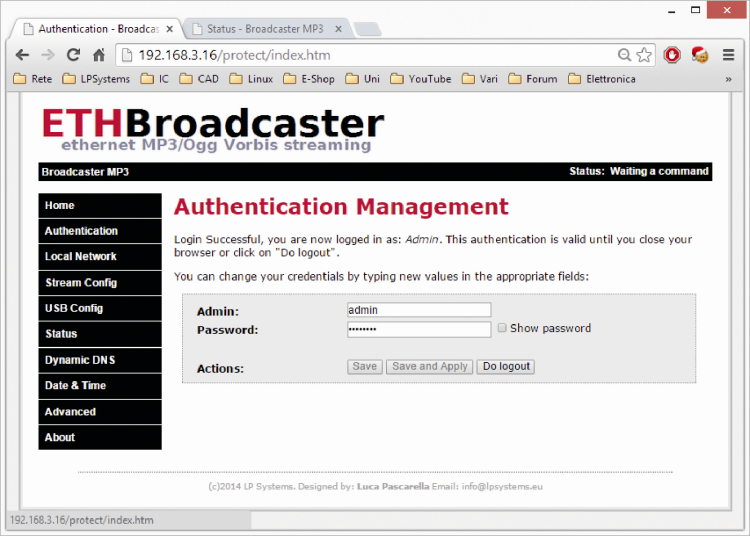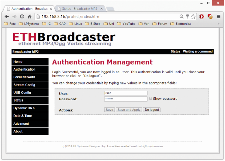 In the Authentication page, you can change your credentials to access all the restricted areas. The software allows two roles, each accessible with username and password. The software recognizes as Admin the role with the highest level of administrator privileges, only it can change all available settings; instead the role with less rights is simply “User”. When you login as administrator in the Authentication page, you get a form (first figure), where you can change your credentials; similarly, when you login as user (as in second figure) you can change the user role settings only.