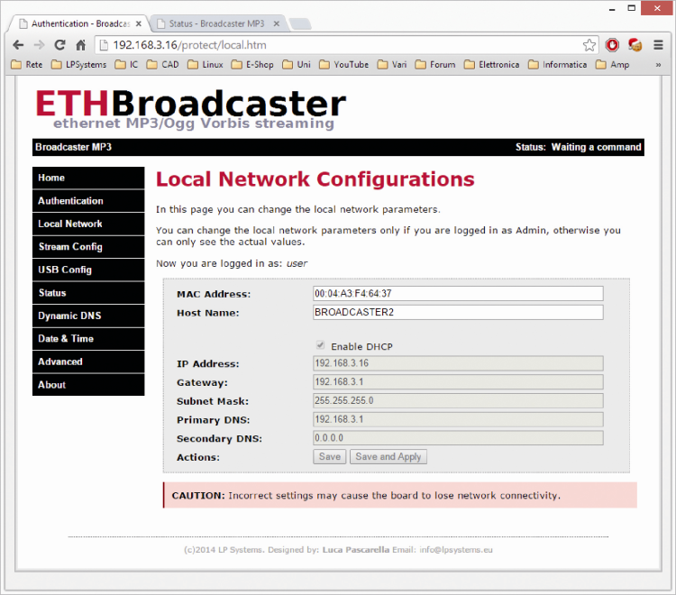 We conclude the description of available commands in the Local Network page with “Enable DHCP“ checkbox, that enables the Dynamic Host Configuration Protocol (DHCP): when the checkbox is unchecked, the page allows manual editing of IP Address, Gateway, Subnet Mask and DNS servers.