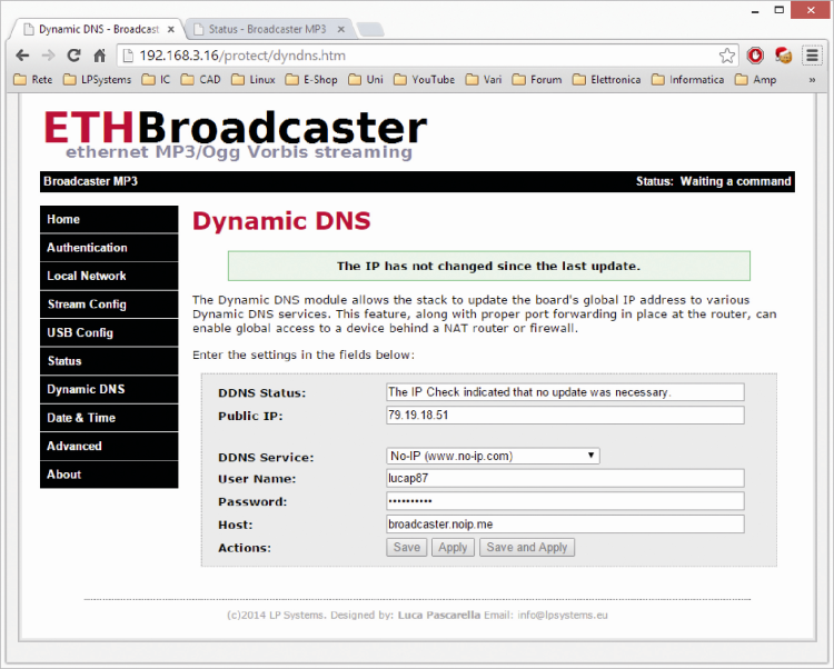 In order to make the board always remotely available, even if the Internet service provider is constantly changing the assigned IP address, you can click on the Dynamic DNS menu item and enter the requested parameters for one of the three DDNS services available provides an example in which the broadcaster.noip.me host name is associated to the board under test.