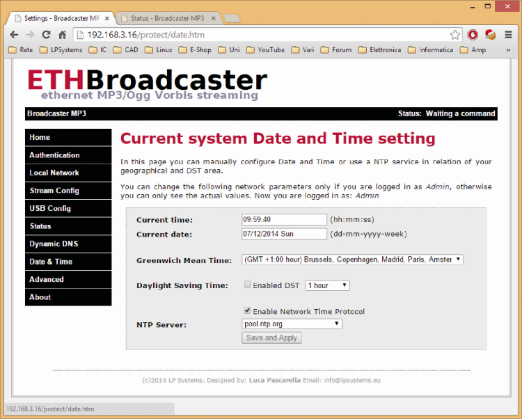 Finally, you can choose to manually enter the correct time or keeping it automatic by using the Network Time Protocol (NTP); in the latter case, since the board is not equipped with a buffer battery, the NTP is particularly effective to set the exact time at each restart. Ticking the Enable Network Time Protocol checkbox, will allow you to select the NTP server or manually enter time and date.