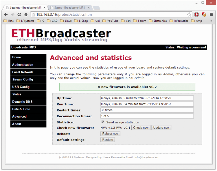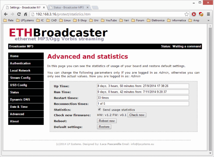 Recently, we have presented an Ethernet audio streaming unit. In particular, we have shown how to configure the boards to work with other similar devices or with VLC Media Player, setting up a point-to-point or a broadcast streaming in all possible configurations. Also in the first episode, we analyzed the electrical circuit and the components choice. Now it is time to describe the board software advanced options and how to update firmware via Internet or manually.