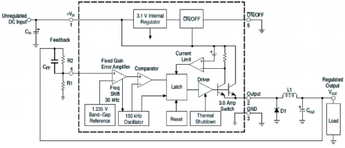 The integrated works on two distinct periods of time, the first period is given by the ON switch condition and the second by the OFF switch condition. In the ON switch condition, the input voltage is connected directly to the inductance input and the recirculation diode is prohibited. During the OFF period, the switch is open and the voltage on the inductance reverses its polarity and triggers the recirculation diode. The current flows through the diode keeping the current loop with the load. The frequency at which the electronic switch is switched on/off is 150kHz as indicated above.