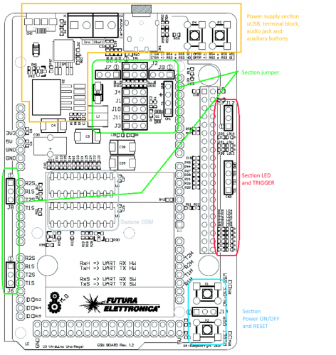 - orange section, where you can find the power supply carried by the micro USB connector, the terminal block for connecting a possible battery backup system, the audio jack and two auxiliary buttons for future developments;