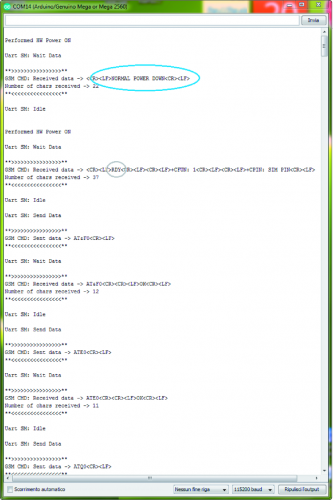 When the serial monitor is started, Arduino is reset and the procedure of initialization of the GSM modules is started, including ignition; however, since the GSM module was already switched on, the impulse sent to the engine actually switches it off and this is deduced from the reception of the string “NORMAL POWER DOWN” (see section circled in blue). The initialization algorithm is able to understand these situations and automatically turns on the GSM module again, this is understood by the reception of the string “RDY” (see section circled in red). Then follows a series of AT commands to initialize the GSM engine including sending the PIN code. The information you see in the serial monitor of the IDE can be enabled/disabled via code, this information is very useful during the debugging of the code. However, in order to have a real view of the information exchanged between the engine and the Arduino/Raspberry Pi boards, it is necessary to use a serial light in hardware assisted by special analysis software.
