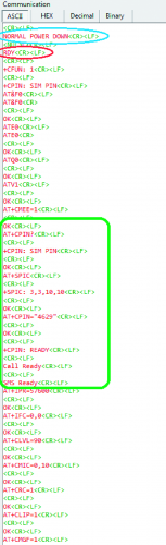 Fig. 11 shows, circled in blue, that the GSM module has been turned off by the library and then on again (in red). Circled in green you can see the AT commands sent to check if it is necessary to send the PIN code to activate the SIM, how many attempts we have available to send the PIN code and the successful activation of the SIM after sending the code itself.
