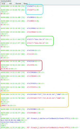 Fig. 12 instead shows the sending of AT commands from PC to configure the GSM module in GPRS mode, in particular during a data connection to a server via TCP protocol; see highlighted in blue the command “AT+CGATT=1” used to connect to the GPRS service, in green the command “AT+CSTT=”ibox.tim.it” used to connect to your APN (GPRS Access Point Name), in red the “AT+CIFSR” command that returns the IP address assigned by GPRS, in yellow the “AT+CIPSTART” command for connecting, via TCP or UDP protocol, to a remote server and its port. Below is a series of commands for sending data, in particular using the PHP code on the server. The above shows the effectiveness in sending AT commands from a PC to study the steps to be followed to correctly configure a data connection to a remote server. Once you have found the right AT command stream, you can implement it in code in your library and its sketch.