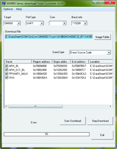It is not necessary to install the software because to use it is sufficient to run, in administrator mode, the file “SIM800_Series_download_Tools_Customer.exe” which will open the work window in Fig. 13, where we can select a number of parameters including the Target (in our case, SIM800C), the communication interface (PortType2, which in this case is a UART), the “Com” to which you are connected and finally the Baudrate. The Com used in the example is COM15 and the baud rate set is 115,200.