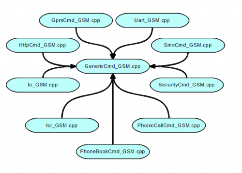 The library architecture is based on a series of C++ files and related .h files with definitions of variables, constants, data structure, etc. The main file, which also contains the procedure for switching on and initializing the GSM module, acts as the basis for the other files that make up the library (Fig. 14).