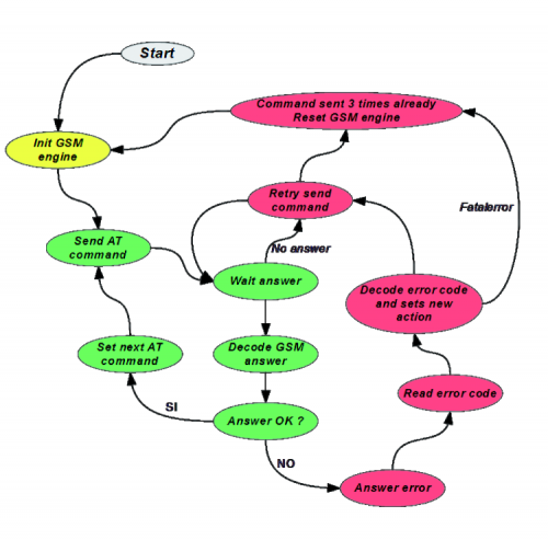 Fig. 15 shows the state machine for sending AT commands and GSM response management: it starts with the initialization of the GSM engine and then enters a loop for sending AT commands. For each AT command sent, a response from the GSM engine is expected and its content is decoded. If the answer is OK, the next AT command will be passed, otherwise the system will return the error code and, depending on the case, will try to send the AT command again up to a maximum of three times. If the AT command is not successful, even after three attempts, the system resets the GSM engine and starts again by re-initializing the same and then returns to the AT command sending loop.
